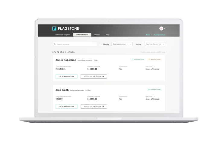 In the same way that clients use Flagstone to manage and monitor their cash, you can use the referral platform to manage and support your clients. One platform for them, one portal for you.